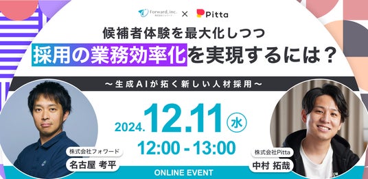 生成AIを活用した採用支援SaaSプロダクト「エースジョブ」を開発・提供する株式会社フォワード(本社:東京都渋谷区、代表:名古屋 考平、以下「フォワード」)は、株式会社Pittaと共催で「候補者体験を最大化しつつ、採用の業務効率化を実現するには?」を12/11(水)に開催いたします。