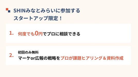「SHINみなとみらい」に参加するスタートアップは、OPEN AGENCYのマーケティングと広報に関する無料の相談と初回の戦略資料作成サービスを受けられます。これにより、起業家はマーケティングや広報の効率化と経営資源の最適化を図ることができます。
