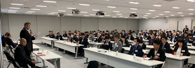当日は、一般消費者向けの商品を製造販売する製造サブライセンシーやオフィシャルストアを運営するサブストアライセンシー、景品頒布品を製造するプレミアムサブライセンシー等、53社134名様がご参加。ミーティングでは、「商品」、「店舗」、「PR」、「IP使用ルール等」の4つのパートに分け、公式キャラクター ミャクミャクを使用した公式ライセンス商品を発売開始した2023年4月から9月までの半期の活動報告や今後の戦略についてお話しました。