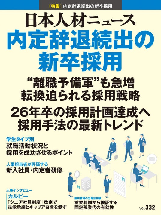 人事専門誌「日本人材ニュース」を発行する株式会社日本人材ニュース社(東京都千代田区、代表取締役:吉越利成)は、2024年5月10日に人事専門誌「日本人材ニュース vol.332~内定辞退続出の新卒採用」を発行しました。