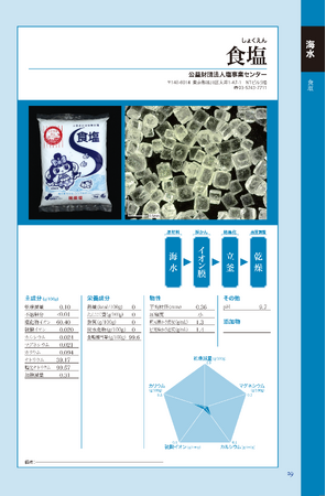 このたび、商品ラインナップを一新し、新たに『市販食用塩データブック2024年版』を発売しました。本書では、2019年版に引き続き、商品の特徴がわかりやすいように、商品を原材料や製造方法別にまとめ、主成分の分析データをレーダーチャートで表しました。また、塩の品質やつくり方について詳しくまとめた「解説編」も掲載しています。
