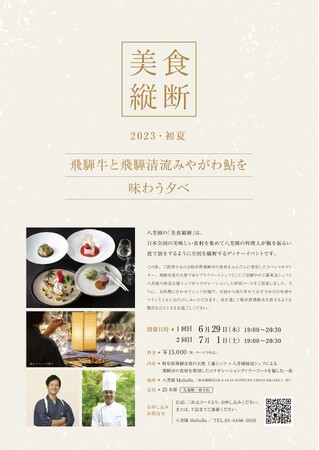 今回、国内各地の地域活性化に取り組まれている八芳園とのコラボイベント『美食縦断2023・初夏 ~飛騨牛と飛騨清流みやがわ鮎を味わう夕べ~』を白金台「八芳園MuSuBu」にて2023年6月29日(木)と7月1日(土)の2日間に渡り開催いたします。