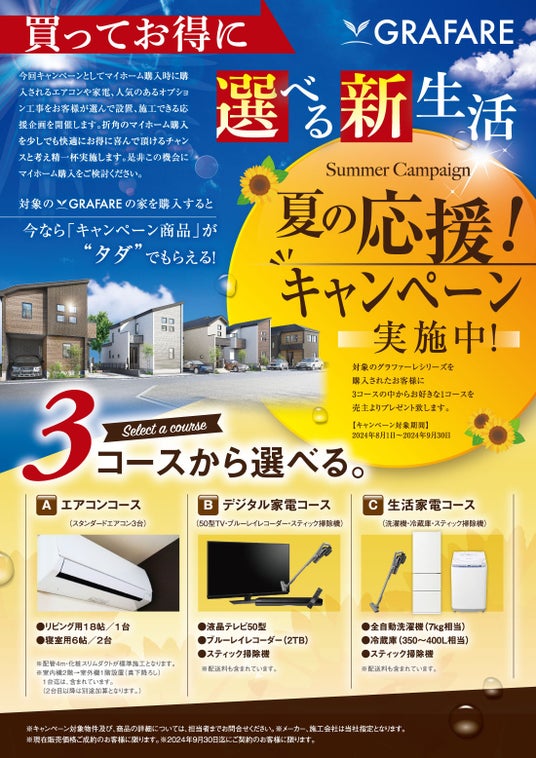 タクトホーム株式会社(本社:東京都西東京市、代表取締役社長:小寺一裕)は、2024年8月1日から2024年9月30日まで、「夏の応援キャンペーン」と題して、対象のグラファーレシリーズをご購入いただいた方に、3つのコースの中からお好きな1つをプレゼントいたします。
