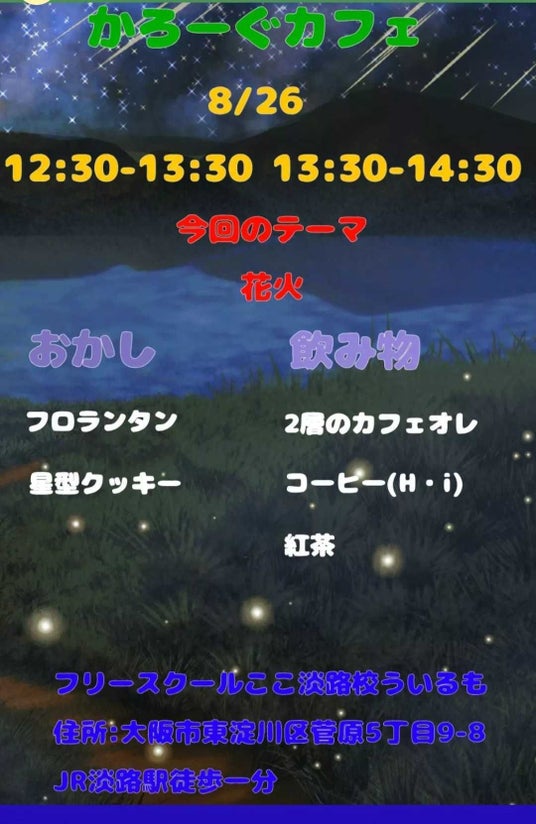 ■開催地:フリースクールここ淡路校【ういるも】1階カフェスペース(大阪府大阪市東淀川区菅原5-9-8)