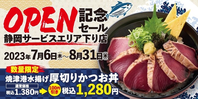 E1A 新東名高速道路(新東名) NEOPASA(ネオパーサ)静岡(下り、静岡県静岡市葵区飯間)にOPENする「海鮮丼 家族庵」ではオープン記念セールとして、7月6日~8月31日の間、焼津港水揚げ厚切りかつお丼をお得な価格で販売致します。ぜひ、夏休みに静岡サービスエリア下り線 海鮮丼 家族庵にお立ち寄りください。
