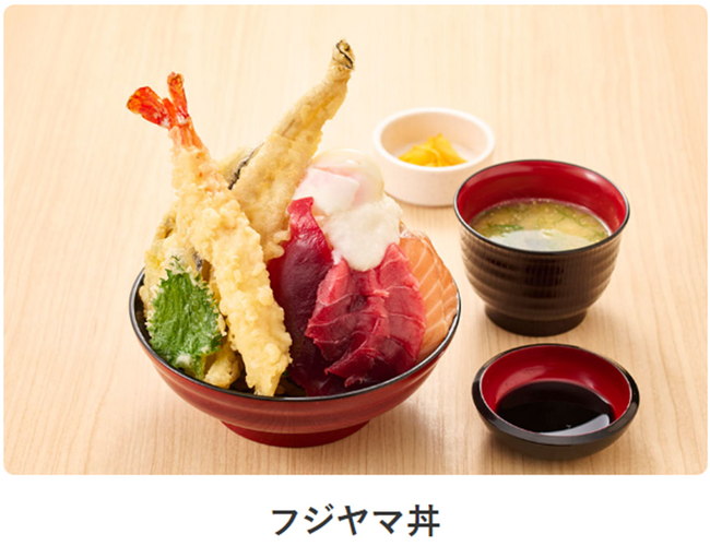 駿河湾産の「桜海老」「しらす」、駿河湾産水揚げまぐろ、焼津港水揚げかつおなどを多彩に使用した海鮮丼をご用意しています。名物は、「フジヤマ丼」!フジヤマをイメージした海鮮と天丼を一度に楽しめるびっくり丼。ボリューム満点、見映えバッチリ!天然南まぐろ・中トロ・サーモン・穴子天・海老天・桜海老のかき揚げ・なす天・かぼちゃ天・大葉天に仕上げにとろろと半熟たまごトッピングして完成。
