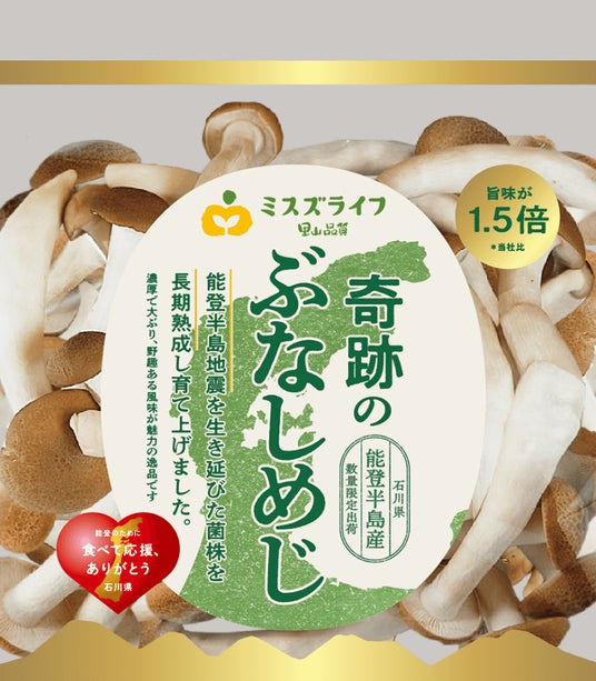同義援金には、能登半島地震を生き延び、当社の能登工場で育ったぶなしめじ『奇跡のぶなしめじ』の売上の一部が含まれています。本商品を通じて“食べて応援”してくださった皆様にも重ねて御礼申し上げます。