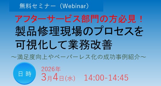 ティアックシステムソリューションズ株式会社(本社:東京都多摩市、代表取締役社長:松本 友伯、以下当社)は、アフターサービス部門の方必見の無料ウェビナー「製品修理現場のプロセスを可視化して業務改善 ~満足度向上やペーパーレス化の成功事例紹介~」を2026年3月4日(水)に開催いたします。
