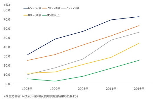 「8020」1989(平成元)年、厚生省(当時)が発表した「成人歯科保健対策検討会 中間報告」の中で提唱されたこの数字、どこかで見たことがあるという方も多いのではないでしょうか。80歳になっても自分の歯を20本以上、保つことを目的に「8020(ハチマル・ニイマル)運動」がスタートして約35年、その間、政策・医療などあらゆる面から口腔ケアに関する取り組みが行われてきました。そうした取り組みは着実に実を結んでおり、1993年以降、65歳以上の高齢者において自分の歯を20本以上持つ人の割合は確実に増加。2016年には65~69歳で73%、85歳以上でも25%以上の人が20本以上自分の歯を有しています(図1)。