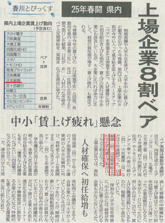 2025年4月25日付の四国新聞「上場企業8割ベア」特集では、県内企業の賃上げ動向が紹介され、当社の姿勢と取り組みもその一例として掲載されました。
