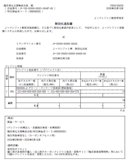 2025年3月18日に販売・買取1回あたり「J-クレジット」1t-CO2、13回分、13t-CO2(累計32t-CO2)を脱炭素化支援株式会社の費用負担により日本政府運営の「J-クレジット」登録簿システムにおいて無効化を実施し、脱炭素社会の実現へ貢献しました。
