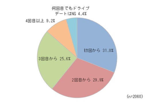 「あなたは何回目のデートからドライブデートはOKだと思いますか」というアンケートに対する調査結果。(n=2060)