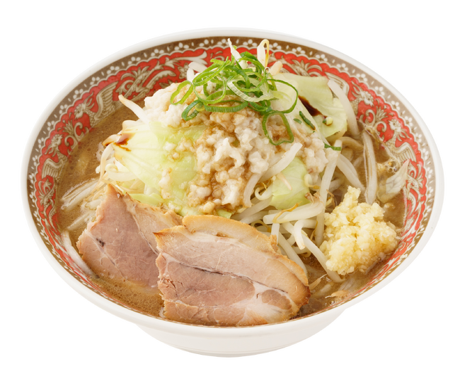 「濃厚スープに太麺、山盛りに盛り付けたもやしとキャベツ」