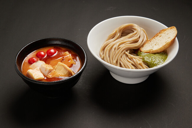 スープはトマト色の赤!濃厚な海老にトマトの酸味が程よくマッチング!バジルソースを麺に絡めるとイタリアンテイストに早変わり!女性に人気のオシャレ系つけ麺