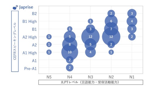 バベルメソッド株式会社(以下、バベルメソッド社)は、日本語で「話す力』をCEFRレベルに基づいて判定するオンラインテスト「Japrise(R)」の受験データを分析し、日本語能力試験(以下、JLPT)との相関調査結果を公表しました。