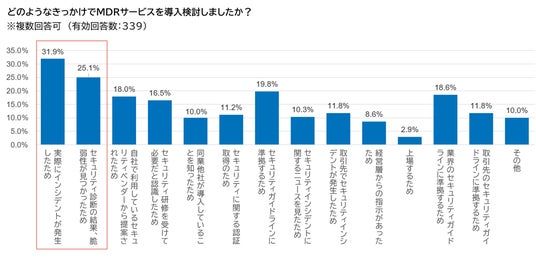 MDRサービス/IRサービスの導入率はまだ高くないものの、「実際にインシデントが起きたため」に導入した企業が多くみられました。発生前にインシデントを防げなければ、システムやデータの被害拡大、顧客などのステークホルダーの信頼喪失、業務中断によるビジネスへの影響など多大な被害が考えられます。そうした被害を防ぐためにも、定期的に自社のセキュリティ状況を診断し、最新の脅威に対応できるツール導入の検討の必要性があるでしょう。