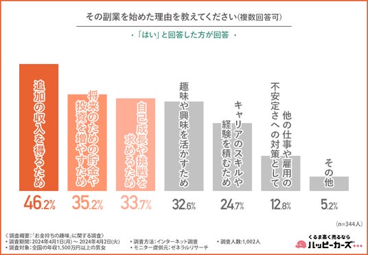 そこで、「その副業を始めた理由を教えてください(服薄回答可)」と質問したところ、『追加の収入を得るため(46.2%)』と回答した方が最も多く、次いで『将来のための貯金や投資を増やすため(35.2%)』『自己成長や挑戦を求めるため(33.7%)』と続きました。メインの仕事以外で収入を得るために副業を始めた方が多いことが示されました。