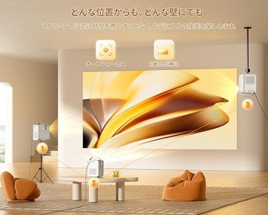 ● オートキーストーン補正 & オートフォーカス: 面倒な設定は不要。投影するだけで、自動的に画面を補正し、ピントを合わせます。