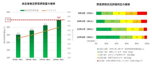 その結果、来店客様(1日平均測定者数369名)の平均推定野菜摂取量は252g/日から347g/日まで95g/日(ベジスコア119ポイント)増加し、野菜不足であった124人の方が目標量350g/日以上まで達成できました4)。