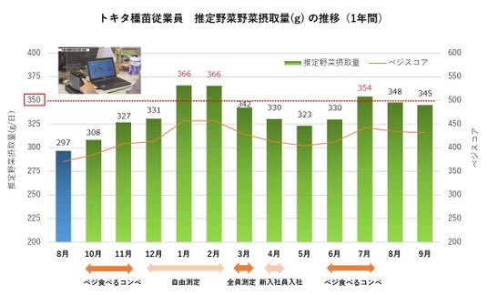種苗会社ということもあり初回の平均推定野菜摂取量は297gと高い結果でしたが、その後1年間に及ぶ継続測定と啓発イベントの結果、従業員の平均推定野菜摂取量は1年後には354gまで改善し、維持されていることが確認されました。