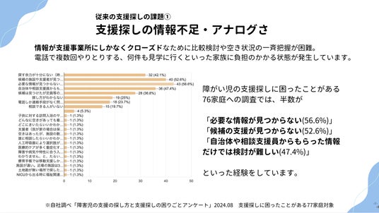 実際にファミケアで実施した「支援探しに困った経験のある家族を対象にしたアンケート」では、約半数が「必要な情報が見つからない」「候補の支援が見つからない」「自治体や相談員からもらった情報では検討が難しい」と回答しています。