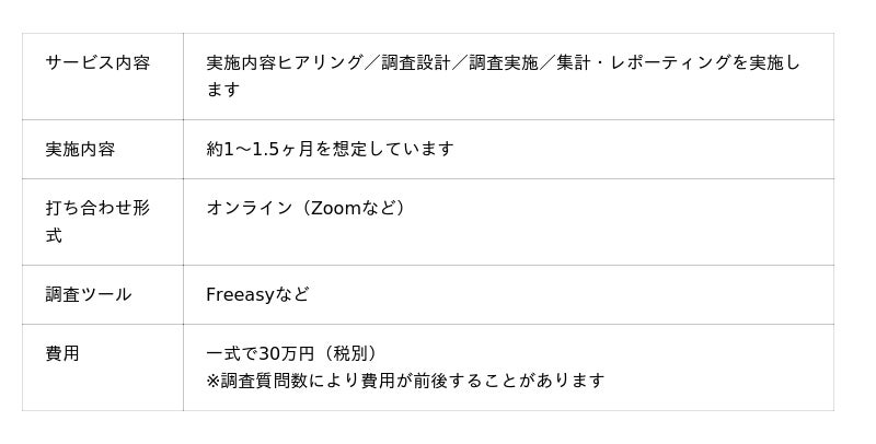 HONEでは「仮説構築~調査設計~実施~ローデータの提供~レポーティング(示唆出し)」までをパッケージ化いたしました。弊社にてまるっと代行いたしますので気になる方はお気軽にお申し付けください。