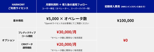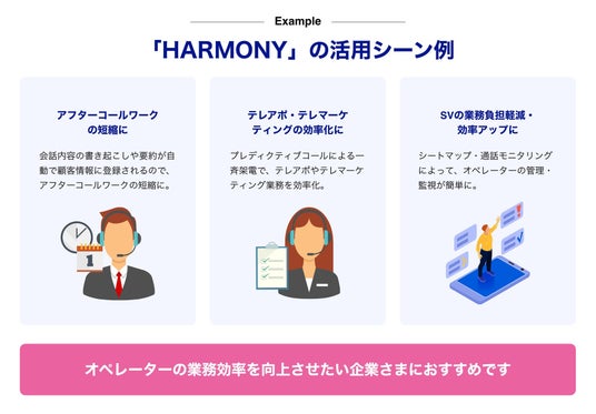 HARMONYは、アマゾン ウェブ サービスのクラウド型コンタクトセンターサービス『Amazon Connect』をベースに、顧客管理や通話履歴管理、プレディクティブコール、シートマップ、パフォーマンス分析といったコンタクトセンター運営に必要な機能と、文字起こし、通話要約、会話議事録生成といった生成AIを活用した機能を提供する最新システムです。
