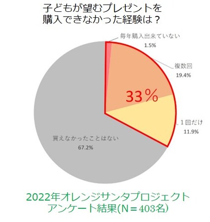 昨年実施したプロジェクトの中で行ったアンケートの結果では、足立区の平均的なプレゼント予算は約5,000円でした。全国の平均的なプレゼント予算は、7,961円(「バンダイこどもアンケートレポートVol.260-1.)より)で、約3,000円に近い差があります。その上で、足立区の子育て家庭では、子どもが望むプレゼントを準備できない経験を持つ家庭が約33%に上ります。毎年購入出来ていない家庭は全体の約1.5%ですが、足立区の子ども(3才~15才)に換算すると約1,200人に相当すると考えられます。