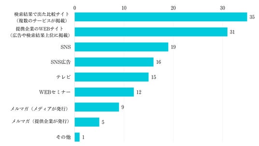 「WEBで検索した際の検索結果」が最も多い回答であったが、「提供企業のWEBサイト」も同様に多くみられた。次いで、「SNS」が多い結果となった。また、それに付随する形で「SNS広告」も多く見られた。