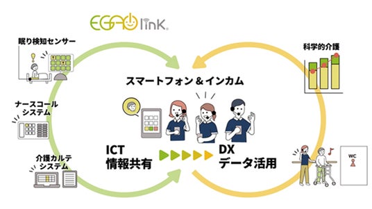 「EGAO link(R)」は、スマートフォン1台で各種記録の入力、コール対応、見守りが可能な業界初のシステムです。メーカー4社との共同開発により2017年に導入され実現しました。当社の介護付きホーム『アズハイム』シリーズ全てのホームに導入されるとともに、当社以外の介護施設でも利用されています。