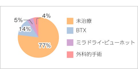 これまで他の治療法を試したことがない方が77%で、BTX(ボトックス・韓国製ボツリヌストキシン)やミラドライ・ビューホット(患部に針を刺して高周波で汗腺を壊す方法)を受けたことがある方は19%です。