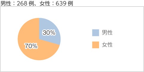 医療法人ジュエリメディカルでは、ミラドライ症例数907例(2024年2月末時点)の治療実績があり、次のグラフの通りに、患者様の性別・年齢・症状などが分布しています。