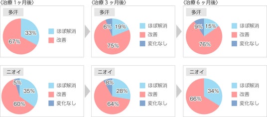 ミラドライ治療の結果、多汗・ニオイ共に、症状がほぼ解消、または、改善した方が、9割以上にあらわれました。また、 治療1ヶ月後よりも6ヶ月を経過した頃のほうが効果が高く認められ、長期間において症状がコントロールできていることがわかりました。