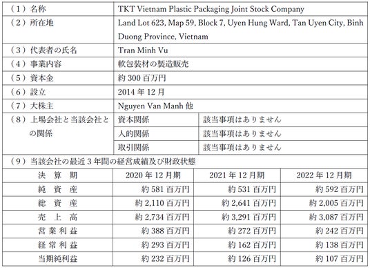ダイナパック株式会社(本社:愛知県名古屋市、代表取締役社長:齊藤 光次、以下「当社」)は、ベトナムのTKT Vietnam Plastic Packaging Joint Stock Companyの株式の90%を取得し、子会社化することといたしましたので、以下のとおりお知らせいたします。
