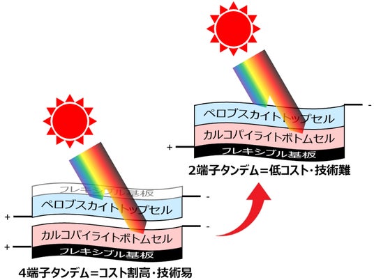 「タンデム化の方法は主に2種類あり、ペロブスカイトとカルコパイライトを別々の基板に形成しておいて、それぞれプラスマイナス2本、合計4本の配線を接続する4端子タンデム型と、同じ基板上に重ねて形成して2本の配線を接続する2端子タンデム型があります。後者は難易度が高いですが、最も低コストな構造となります。PXPでは現在4端子タンデムで試作を行っておりますが、低コスト化のために2端子タンデム化技術に挑戦しています。将来的にはシンプルで低コストな曲がるタンデム太陽電池を実現できると考えています。」