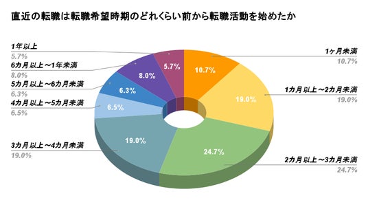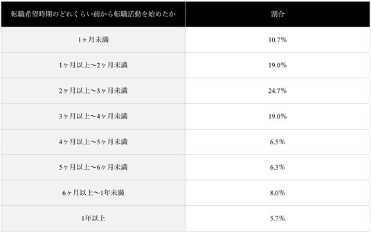 転職希望時期のどれくらい前から転職活動を始めたかを調査した結果は以下のとおりです。