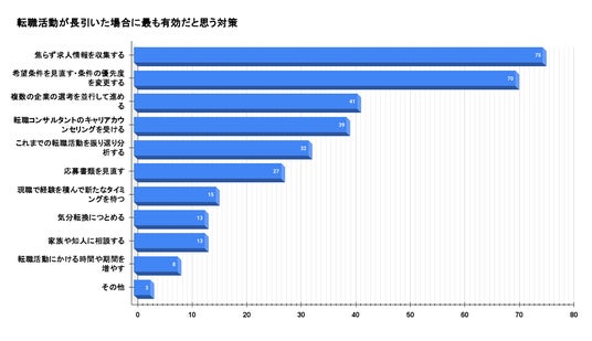 - 転職活動が長引いた場合に有効だと思う対策は「焦らず求人情報を収集する」