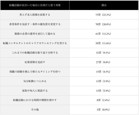 転職活動が長引いた場合に有効だと思う対策では「焦らず求人情報を収集する」「希望条件を見直す・条件の優先度を変更する」「複数の企業の選考を並行して進める」が上位3つを占めました。