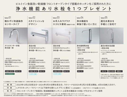 ビルトイン食器洗い乾燥機フロントオープンタイプ搭載のキッチンをご採用いただいた方に、浄水機能あり水栓※を1つプレゼントします