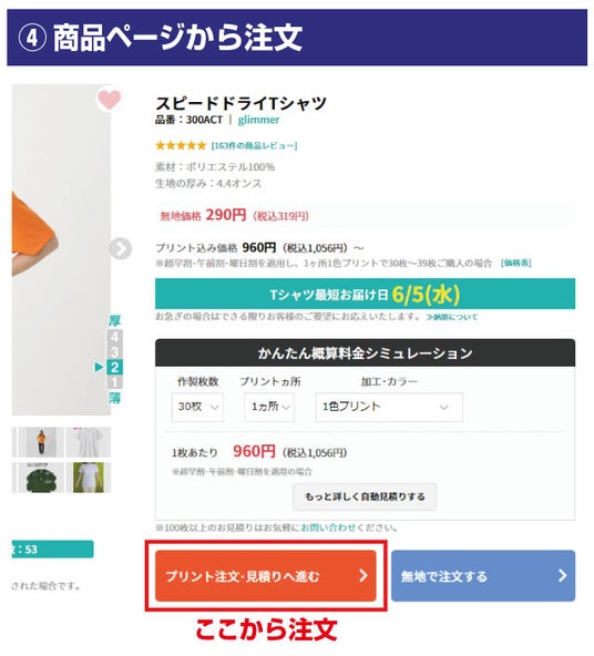 4.商品ページから注文商品ページの「プリント注文・見積もりへ進む」ボタンからお申込みいただき、商品カラーやサイズ、枚数を入力します。