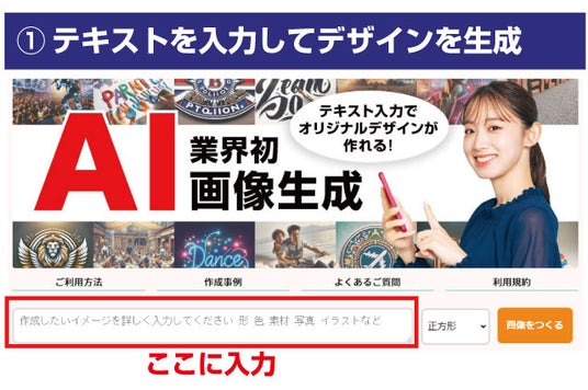 「AI」と呼ばれる人工知能に、作りたいイメージを指示するだけで、自動的に写真やイラストを作成するサービスです。イラストや写真はもちろん、刺繍のようなデザインやエンブレム風のデザインなど、どのようなデザインでもテキスト入力のみで画像生成が可能です。