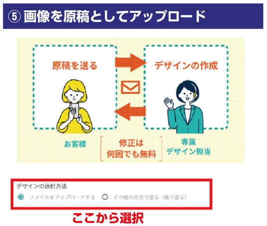 5.画像を原稿としてアップロード保存した生成画像を原稿として、アップロードします。生成した画像の修正も可能です。その際は「その他ご要望」欄に修正内容を記入します。
