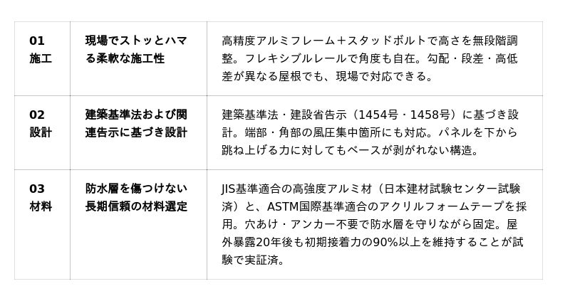建物ごとに異なる勾配・段差・防水層の条件。防水保証を守りながらの固定。台風・地震に対して本当に安心できる強度設計。そして現場で職人が「ラクに、正確に」扱えること。