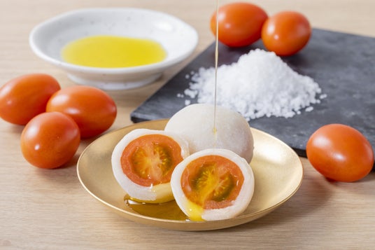 まるでフルーツかとおもうような甘みとみずみずしさで、今までなかった新感覚の味わいを感じられる、最高級のフルーツトマトを、弁才天のこだわりの白餡と求肥で包みました。