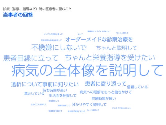 当事者、医療者に対する同趣旨の質問にいただいた記述回答に関しては、当事者と医療者の回答の差異が視覚的にわかるようにワードクラウドを作成しました。 回答ごとにその内容によって1~3個程度のキーワードを割り振り、そのキーワードの出現頻度を集計したものです。