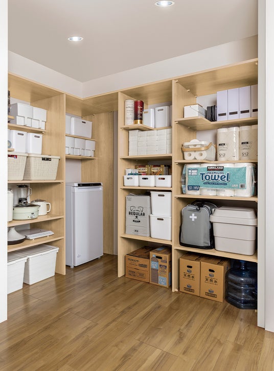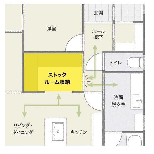 この納戸スペースを機能的にするために、収納物を1ヶ所で計画的に管理することで必要なタイミングで必要な量の物を取り出せる「ストックルーム収納」としての活用をご提案いたします。
