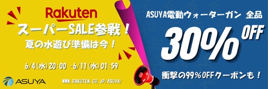 水遊びを「最高のヒーロー体験」へと進化させるASUYA(運営:株式会社Asuya、本社:東京都新宿区)は、2025年6月4日(水) 20:00から2025年6月11日(水) 01:59まで開催される「楽天スーパーSALE」に、ASUYA公式 楽天市場店として参加することをお知らせいたします。