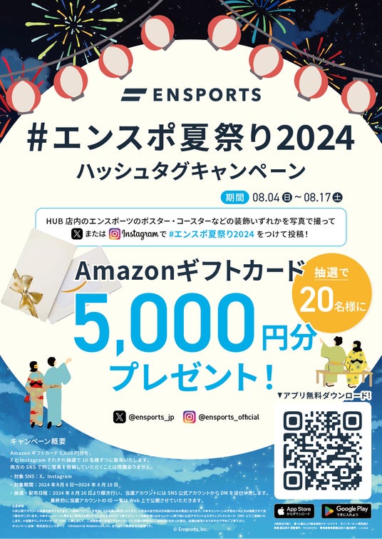期間内に対象店舗内に設置されるエンスポーツ装飾を写真に撮って対象SNSで応募すると、抽選で合計20名様に5,000円分のAmazonギフト券をプレゼント。