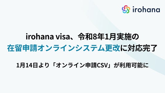 いろはな株式会社(本社:東京都新宿区、代表取締役:澤和寛昌 以下「いろはな」)が提供するビザ申請管理システム「irohana visa」は、令和8年1月に入国管理庁により実施された在留申請オンラインシステムの更改に対応を完了いたしました。2026年1月14日(火)より、特定技能ビザの申請において、システム上に登録した情報を利用したオンライン申請のご利用が可能となります。