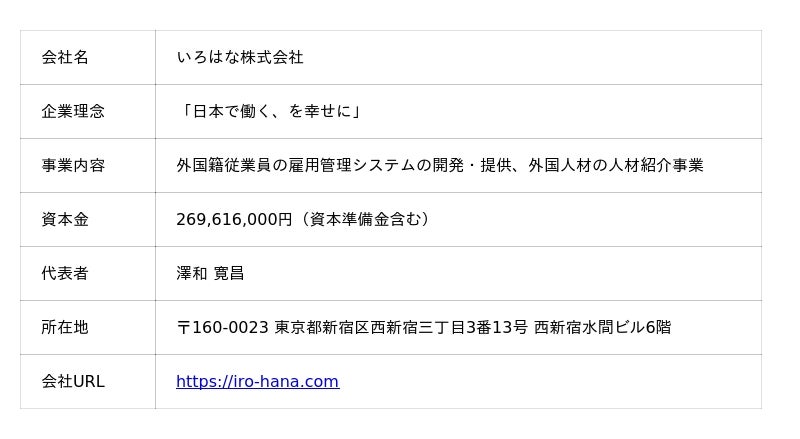 いろはな株式会社は、外国人材の採用・在留管理・支援業務を効率化するクラウドサービス群を提供しています。「日本で働く、を幸せに。」をミッションに掲げ、登録支援機関向け・受入企業向けのDXソリューションや、人材紹介サービスまで幅広くラインナップを展開しています。これまでに多数の導入事例があり、現場業務を支える実務重視の機能とサポートを特徴としています。